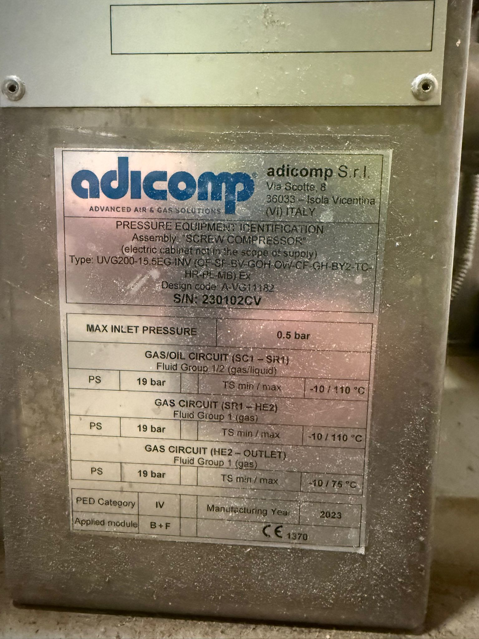 - Compressor: Adicomp screw compressor (UVG-200)